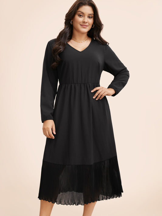 Mesh Patchwork Lantern Sleeve Pleated Dress