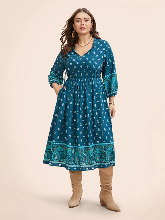 Paisley Print Tie Knot Lantern Sleeve Dress