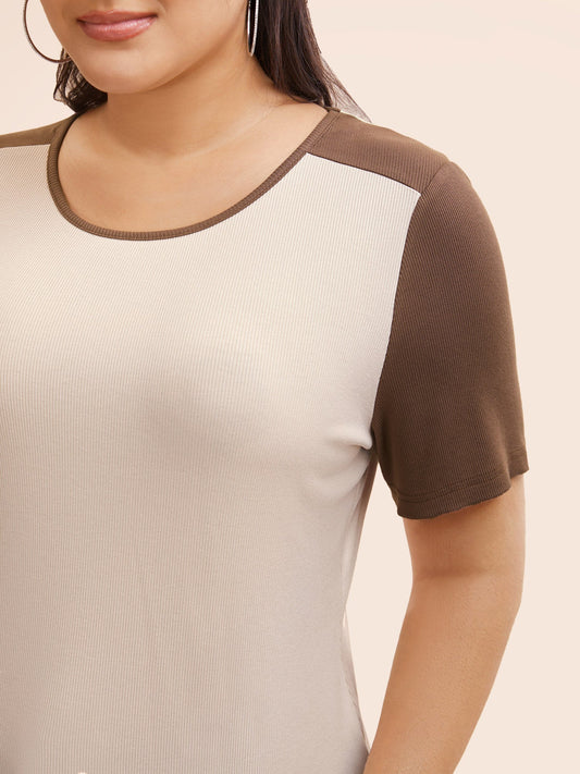 Crew Neck Contrast Patchwork Rib Knit T-shirt