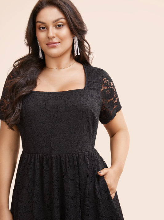 Square Neck Lace Mesh Midi Dress