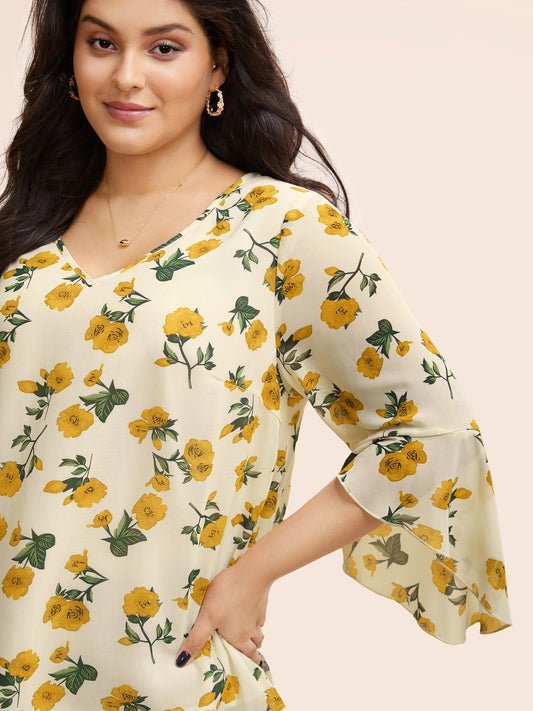 Floral Ruffle Sleeve Split Hem Blouse