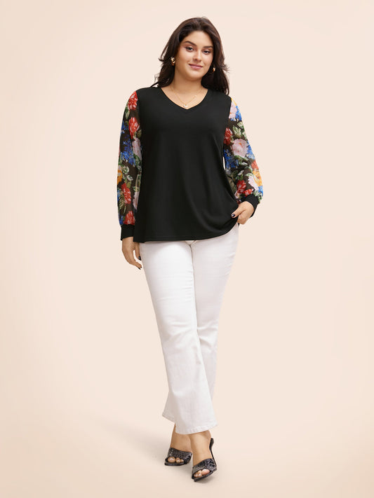 V Neck Floral Patchwork Mesh T-shirt