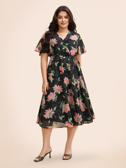 Overlap Collar Floral Split Hem Dress