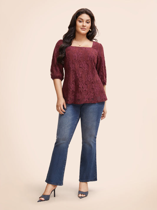 Square Neck Lace Panel Lantern Sleeve Blouse
