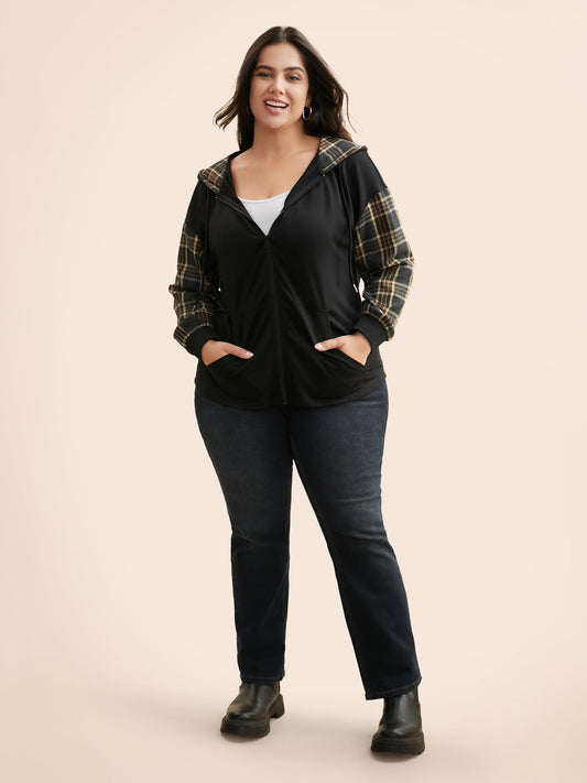 Plaid Patchwork Hooded Drawstring Sweatshirt