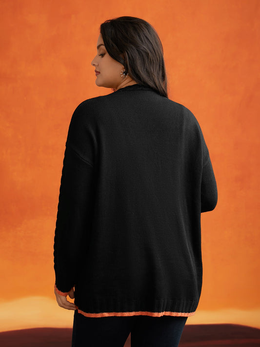 Pumpkin Pocket Embroidered Contrasting Cardigan - For Halloween