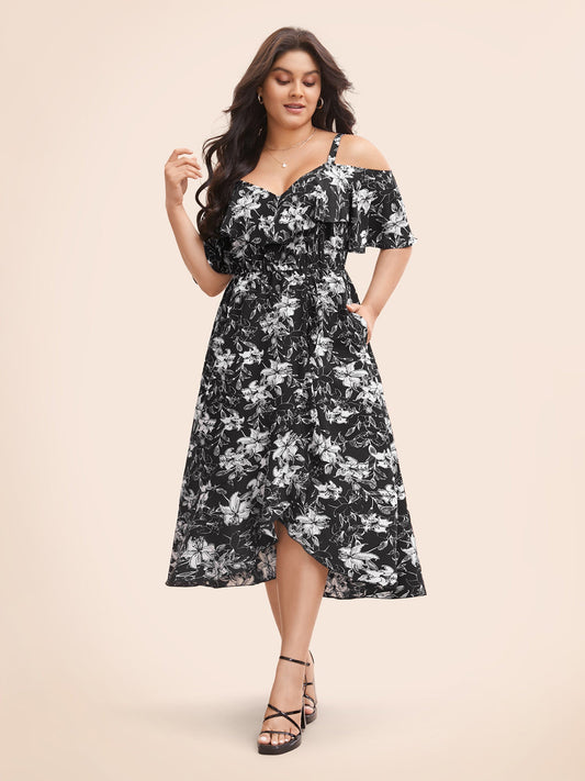 Floral Heart Neckline Ruffle Trim Dress