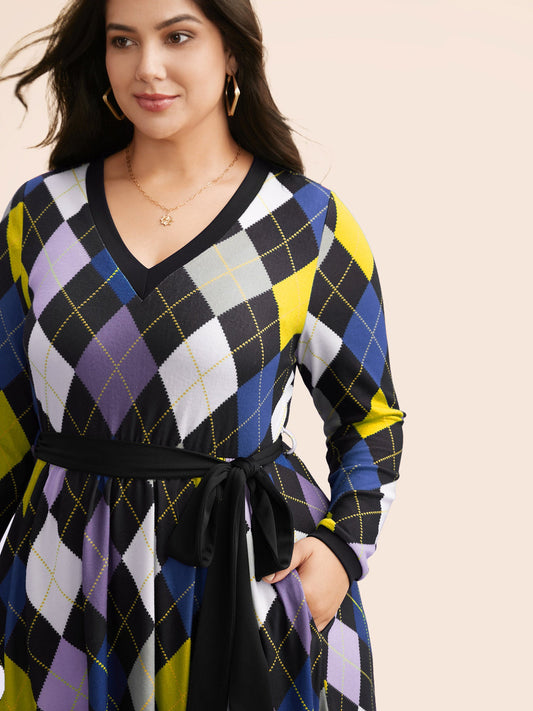 V Neck Colorblock Contrast Belted Dress