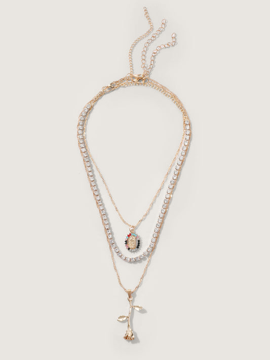 Rhinestone & Rose Charm Layered Necklace