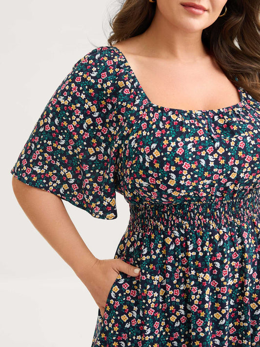 Floral Shirred Bodice Contrast Midi Dress