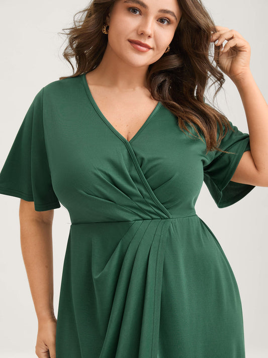 Wrap Gathered Solid Surplice Midi Dress