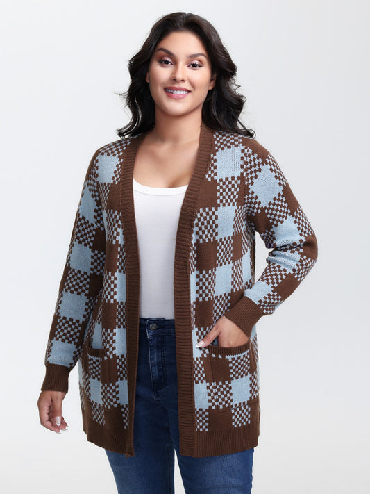 Checkered Pattern Pockets Knit Cardigan