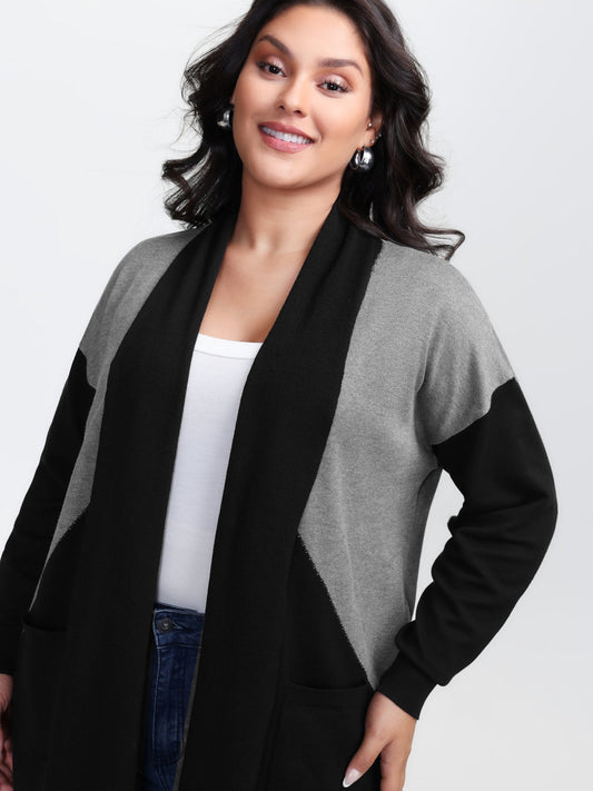 Color Patches Kimono Collar Pockets Knit Cardigan