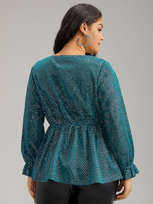 Sequin Wrap Ruffles Ruched Lantern Sleeve Blouse