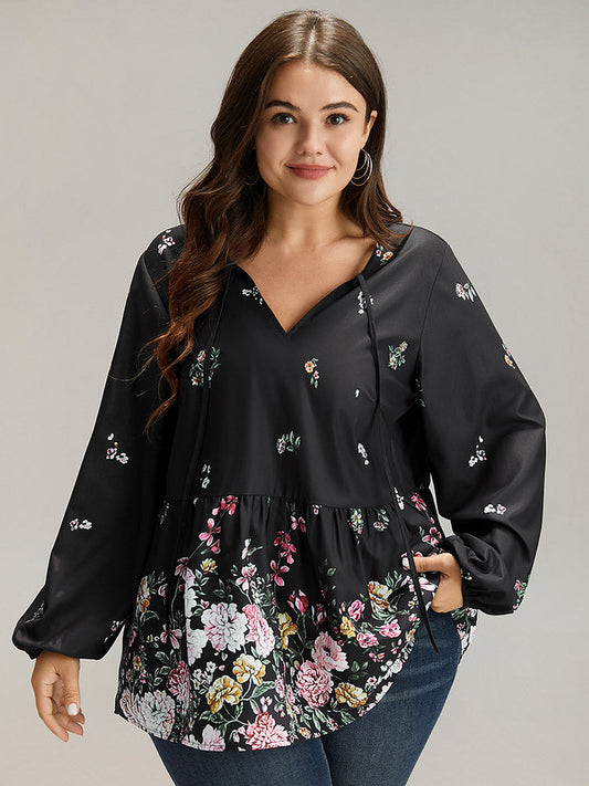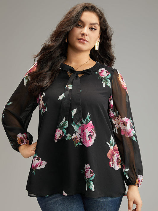 Velvet Floral Contrast Knot Neck Tassel Blouse