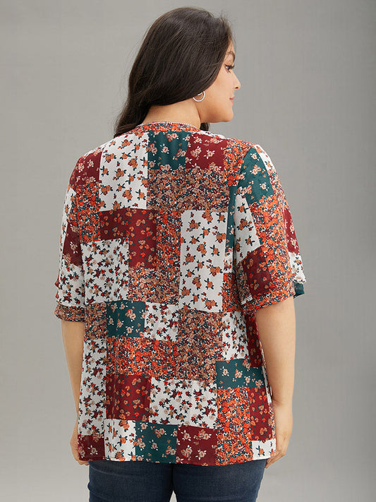 Ditsy Floral Colorblock Contrast Notched Blouse