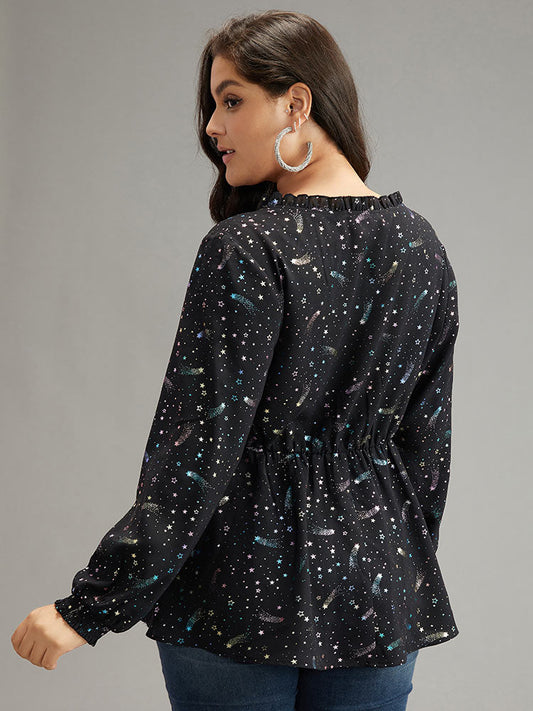 Star Glitter Shirred Frill Trim Lantern Sleeve Blouse