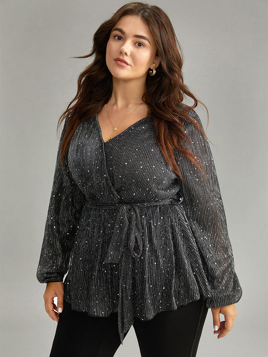 Halloween Sequin Belted Elastic Waist Ruffle Hem Blouse
