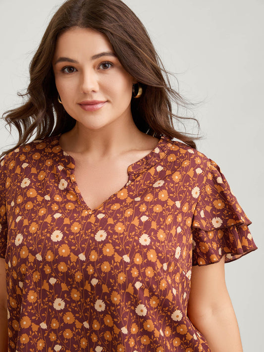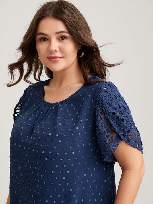 Textured Lace Petal Sleeve Pleated Neck Blouse