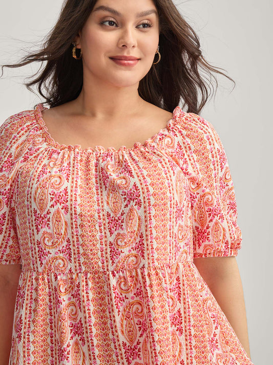 Stripe Paisley Print Ruffled Neck Blouse