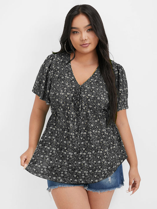 Ditsy Floral Tie Flutter Sleeve Blouse