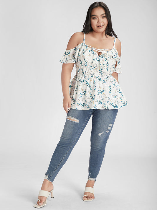 Floral Crisscross Front Cold Shoulder Ruffle Blouse