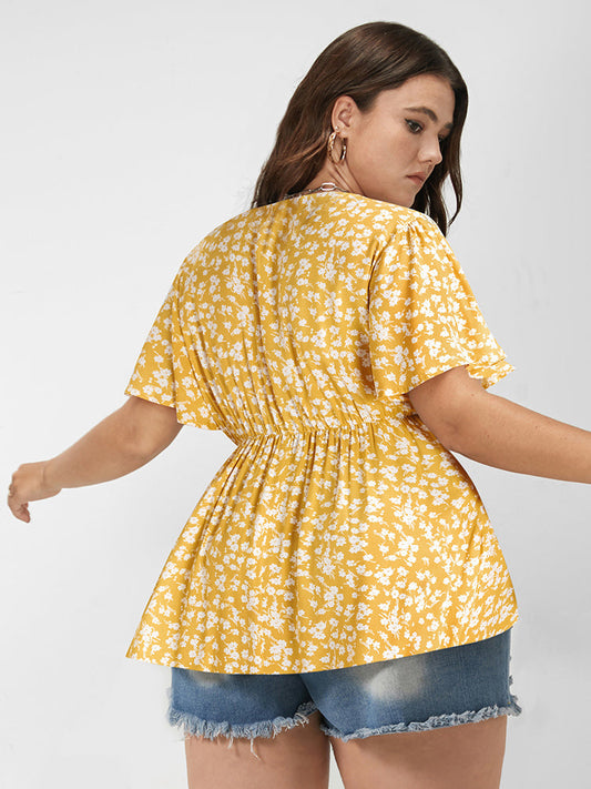 Floral Ruffle Cold Shoulder Drawstring Blouse