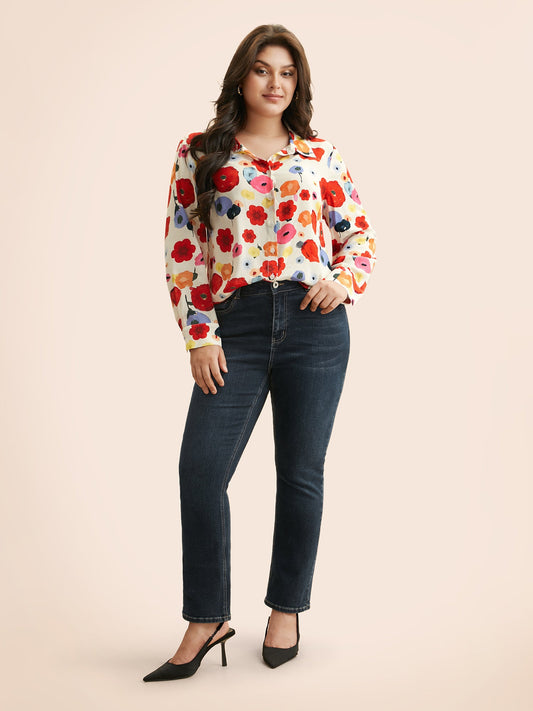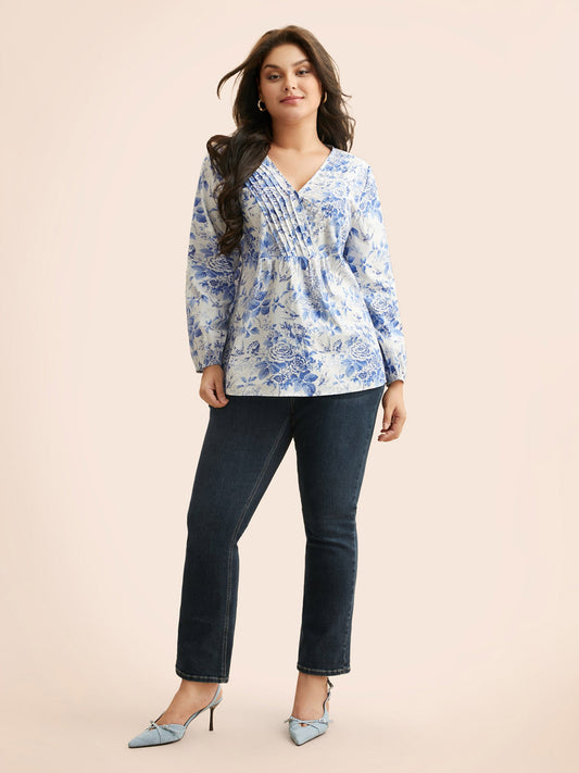 Cotton Floral Pleated Lantern Sleeve Blouse