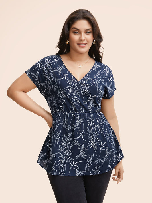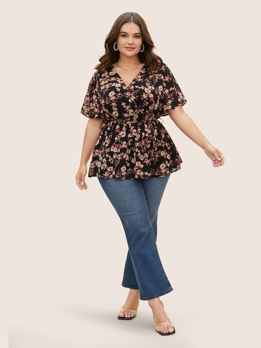 Chiffon Floral Overlap Collar Elastic Waist Blouse