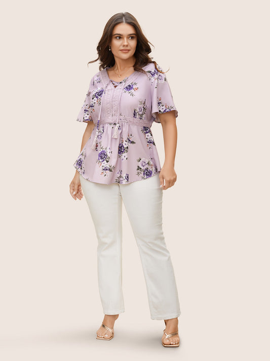 Floral Lace Panel Tassel Trim Ruffle Sleeve Blouse