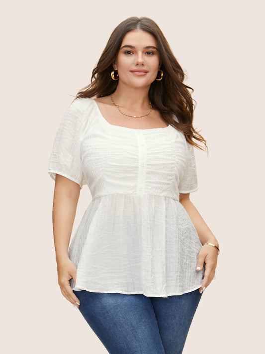 Square Neck Shirred Button Detail Lantern Sleeve Blouse