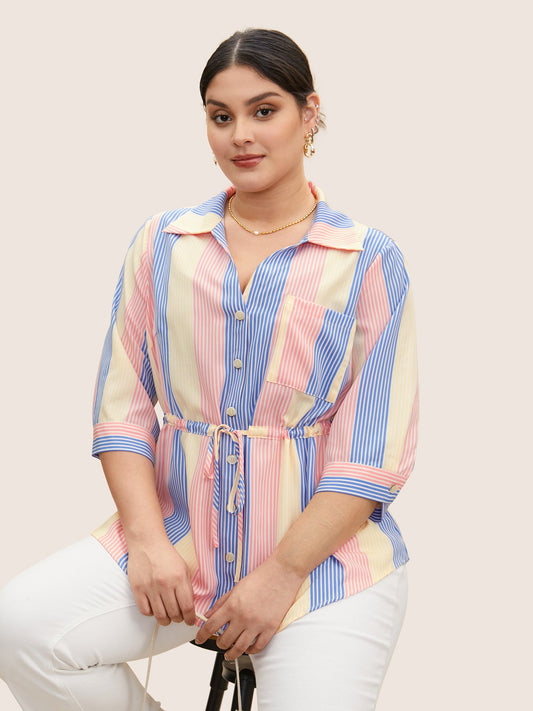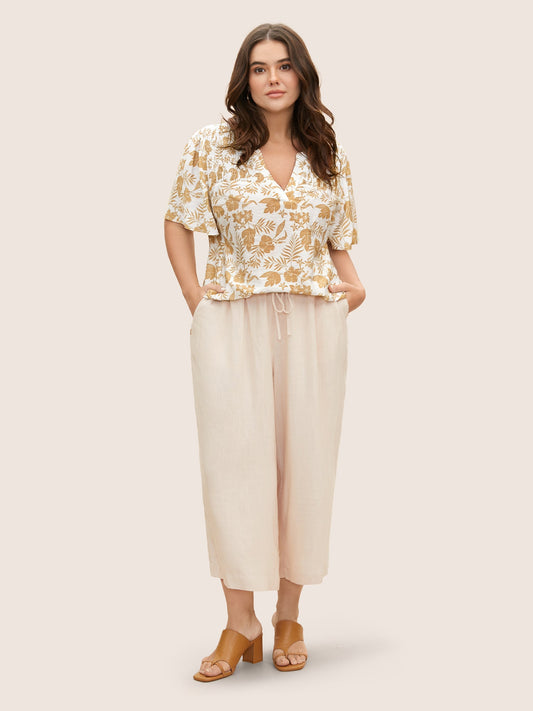 Linen Blend Tropical Print Lace Up Lantern Sleeve Blouse