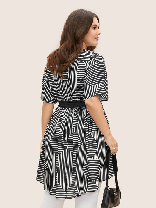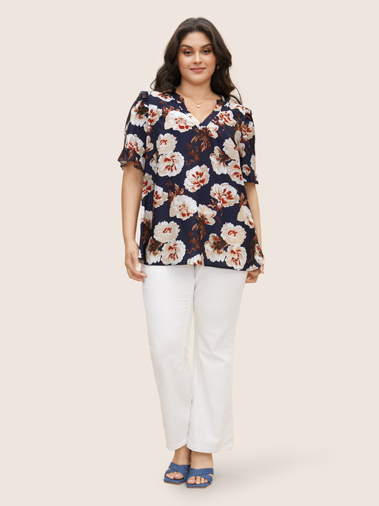 Overlap Collar Floral Elastic Waist Petal Sleeve Blouse