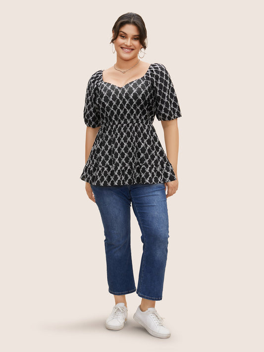Embroidered Heart Neckline Lantern Sleeve Blouse
