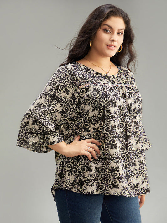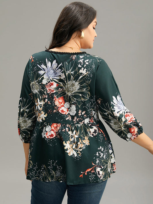 Floral Print Knot Neck Pompom Trim Gathered Blouse