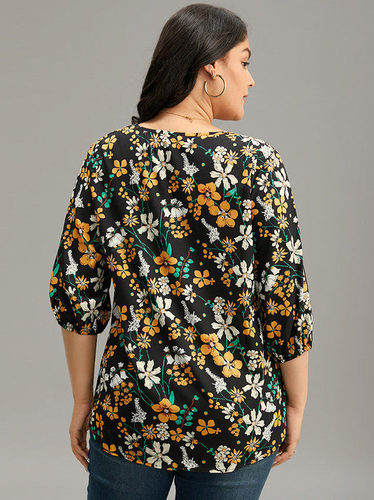 Floral Print Pleated Notched Lantern Sleeve Blouse