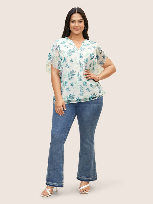 Anti-Wrinkle Shirred Ruffle Sleeve Mesh Frill Trim Blouse
