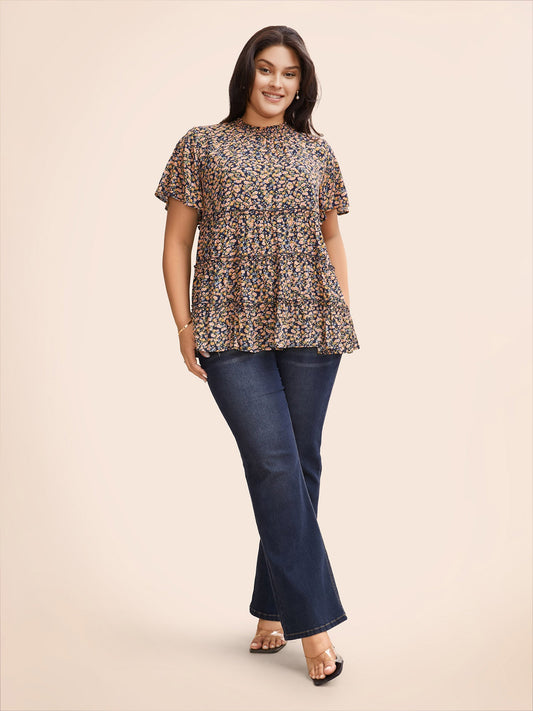 Ditsy Floral Frill Trim Shirred Mock Neck Blouse