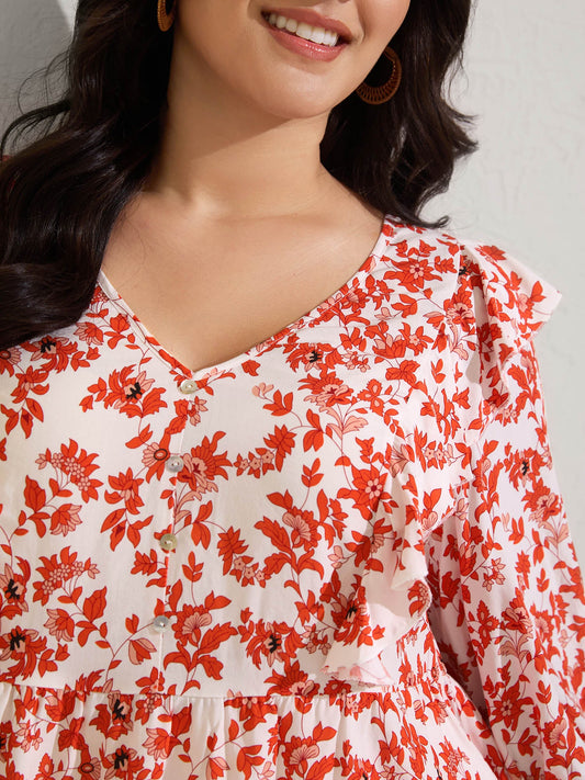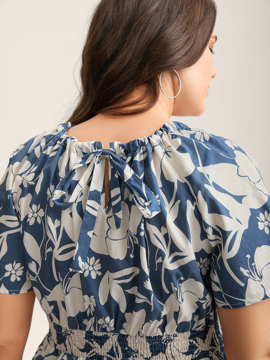 Cotton Boho Embroidered Neck Shirred Shoulder Blouse