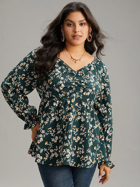 Floral Print Ruched Lantern Sleeve Blouse