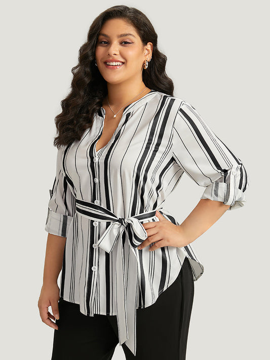 Striped Arc Hem Belted Roll Tab Sleeve Blouse