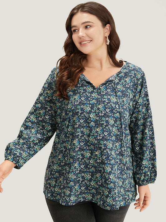 Ditsy Floral Knot Neck Elastic Cuffs Blouse