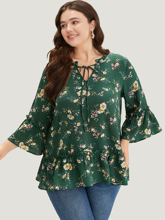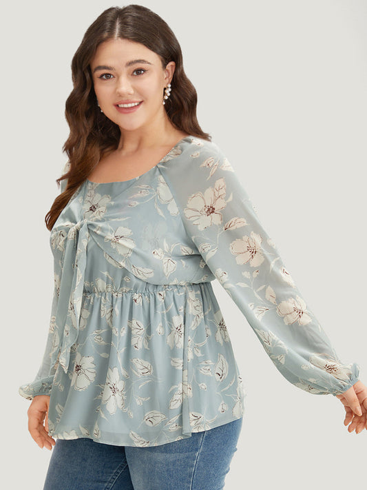 Silhouette Floral Print Twist Front Gathered Lantern Sleeve Blouse