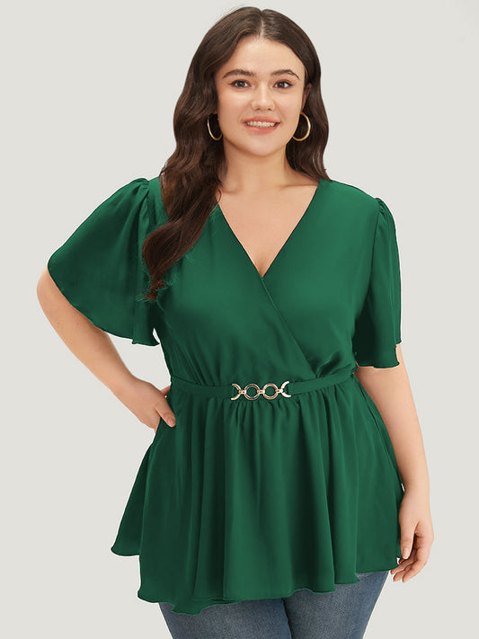 Anti-Wrinkle Plain Wrap Metal Detail Gathered Flutter Sleeve Blouse