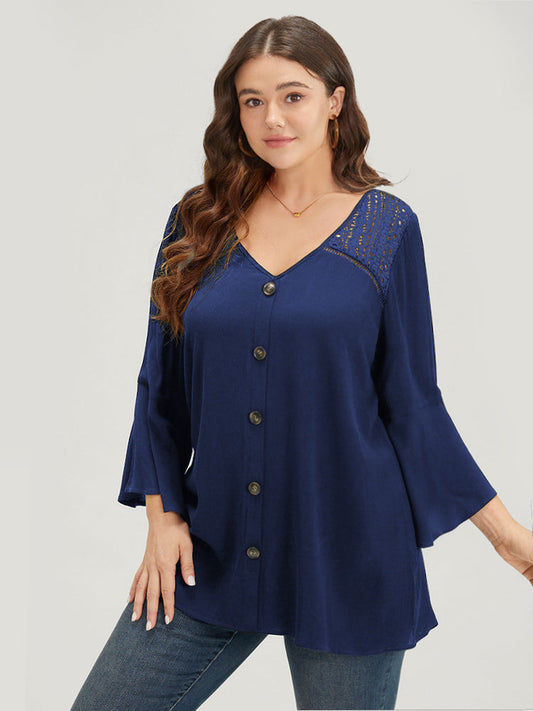Plain Crochet Lace Button Detail Bell Sleeve Blouse