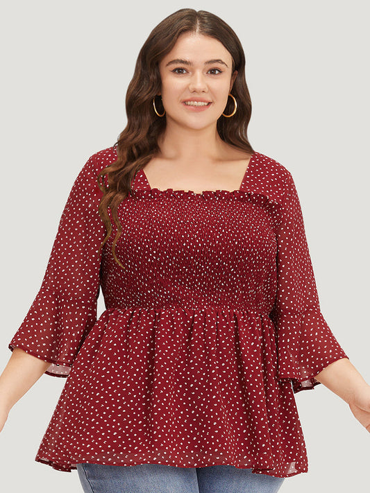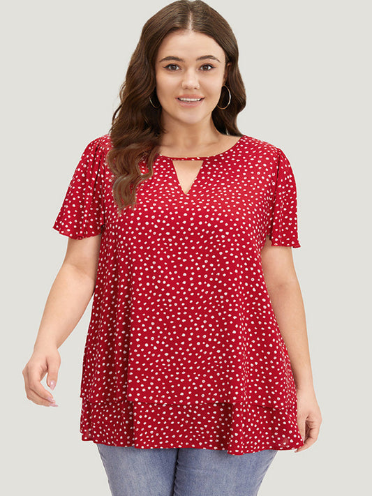 Polka Dot Keyhole Flutter Sleeve Layered Hem Blouse