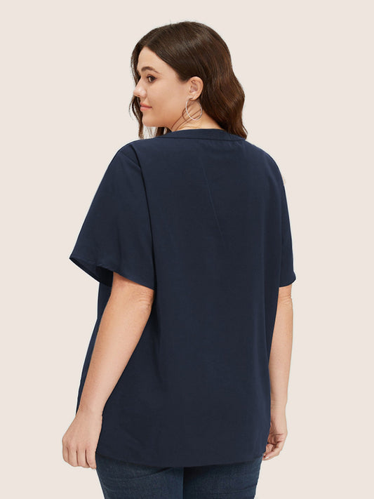 Anti-Wrinkle Plain Button Up Knot V Neck Pocket Blouse