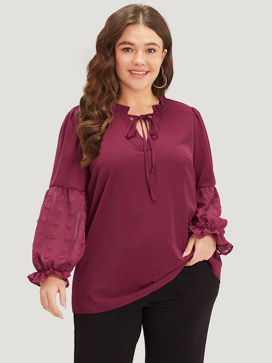 Anti-Wrinkle Plain Knot Neck Frill Trim Lantern Sleeve Blouse