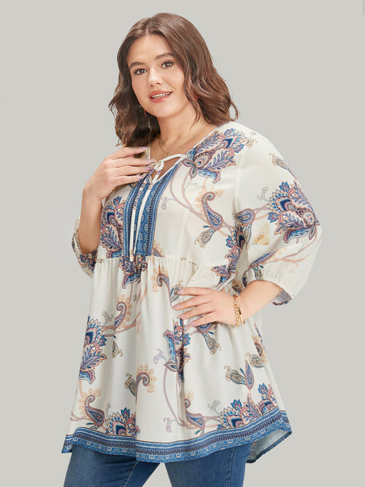 Boho Print Knot Neck Lantern Sleeve Blouse