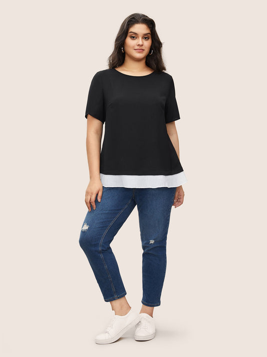 Patchwork Chiffon Asymmetrical Neck Button Detail Blouse